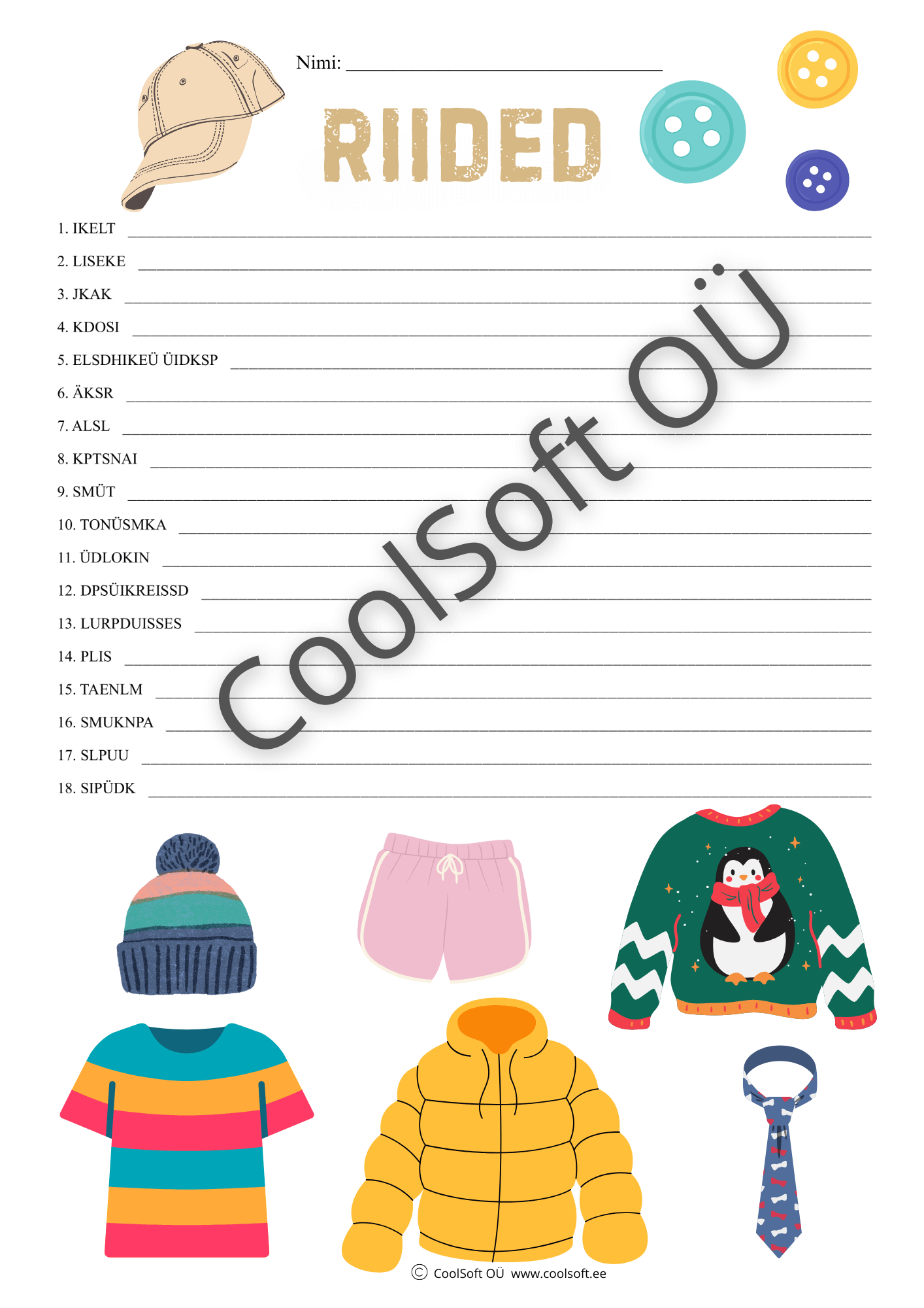 Riided on arendav tööleht, kus laps moodustab segamini tähtedest õiged riideesemete nimetused. 👕🧢👖