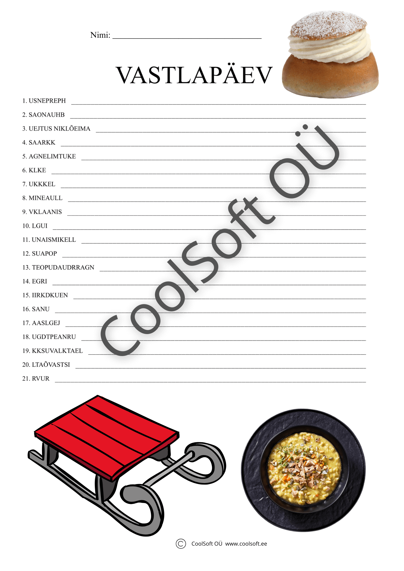 Vastlapäev on mänguline ja hariv tähtede segamise tööleht, kus laps paneb tähed õigesse järjekorda, moodustades vastlapäevaga seotud sõnu. 🎿🥣❄️