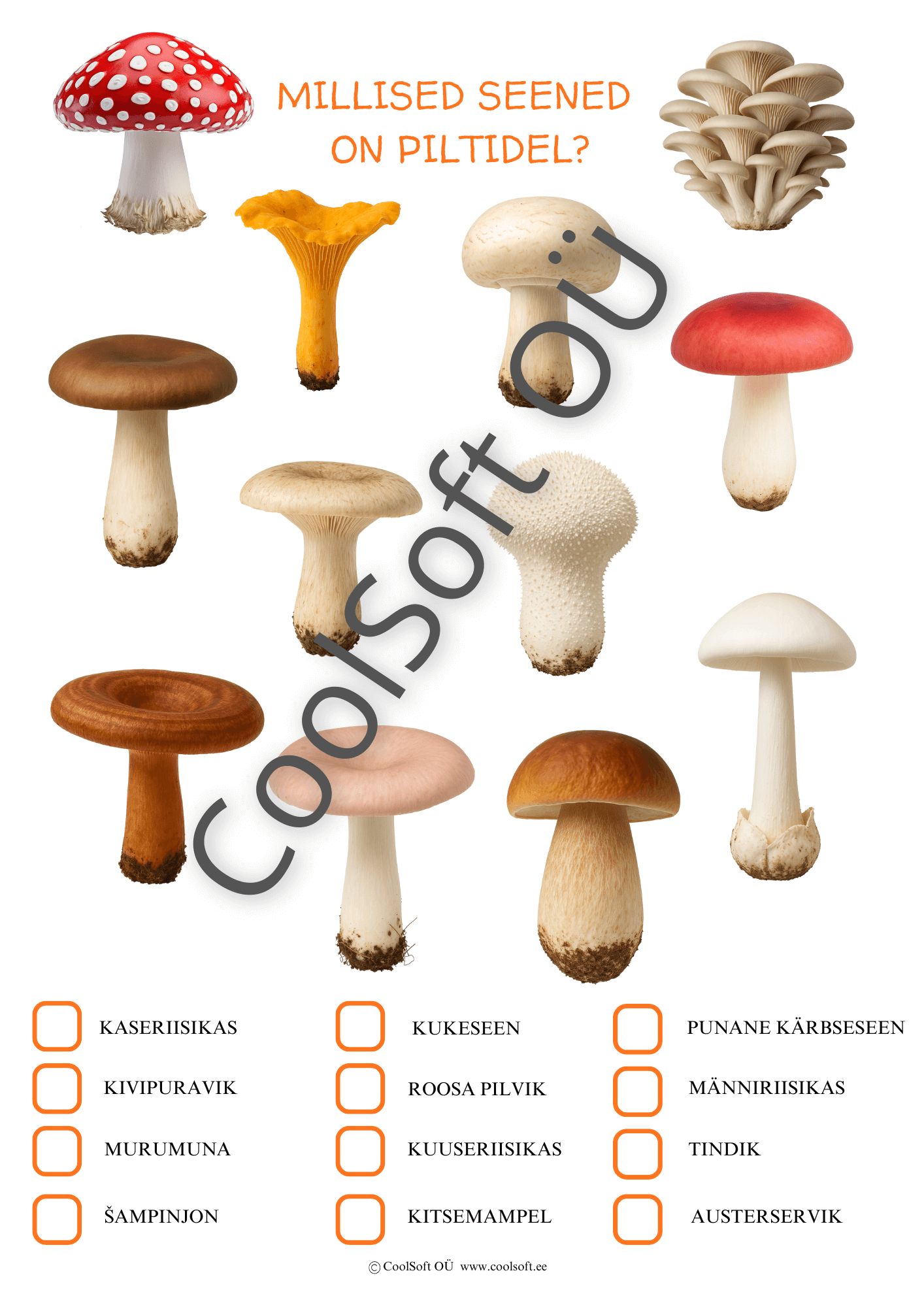 Õpi tundma seeni piltide kaudu. Piltidel on kujutatud järgmised märgistamisele kuuluvad seened: kaseriisikas, kivipuravik, murumuna, šampinjon, kukeseen, roosa pilvik, kuuseriisikas, punane kärbseseen, männiriisikas ja austerservik.