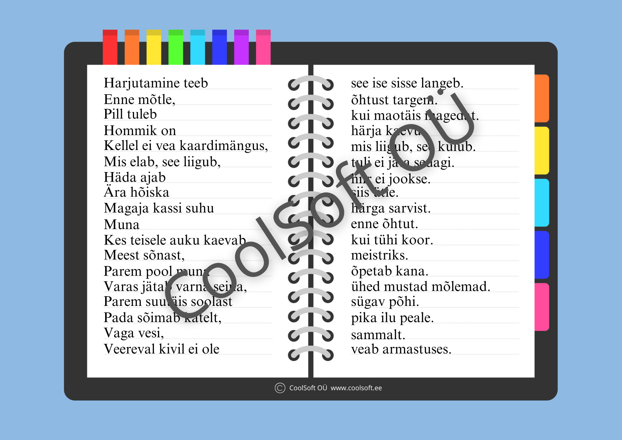 Vanasõnade 10-leheküljeline töölehtede kogumik tutvustab lapsele eesti keele rikkust läbi tuntud ja õpetlike vanasõnade.
