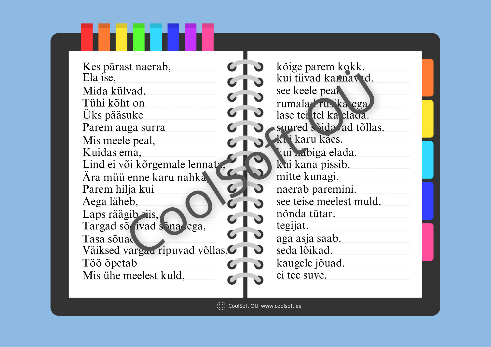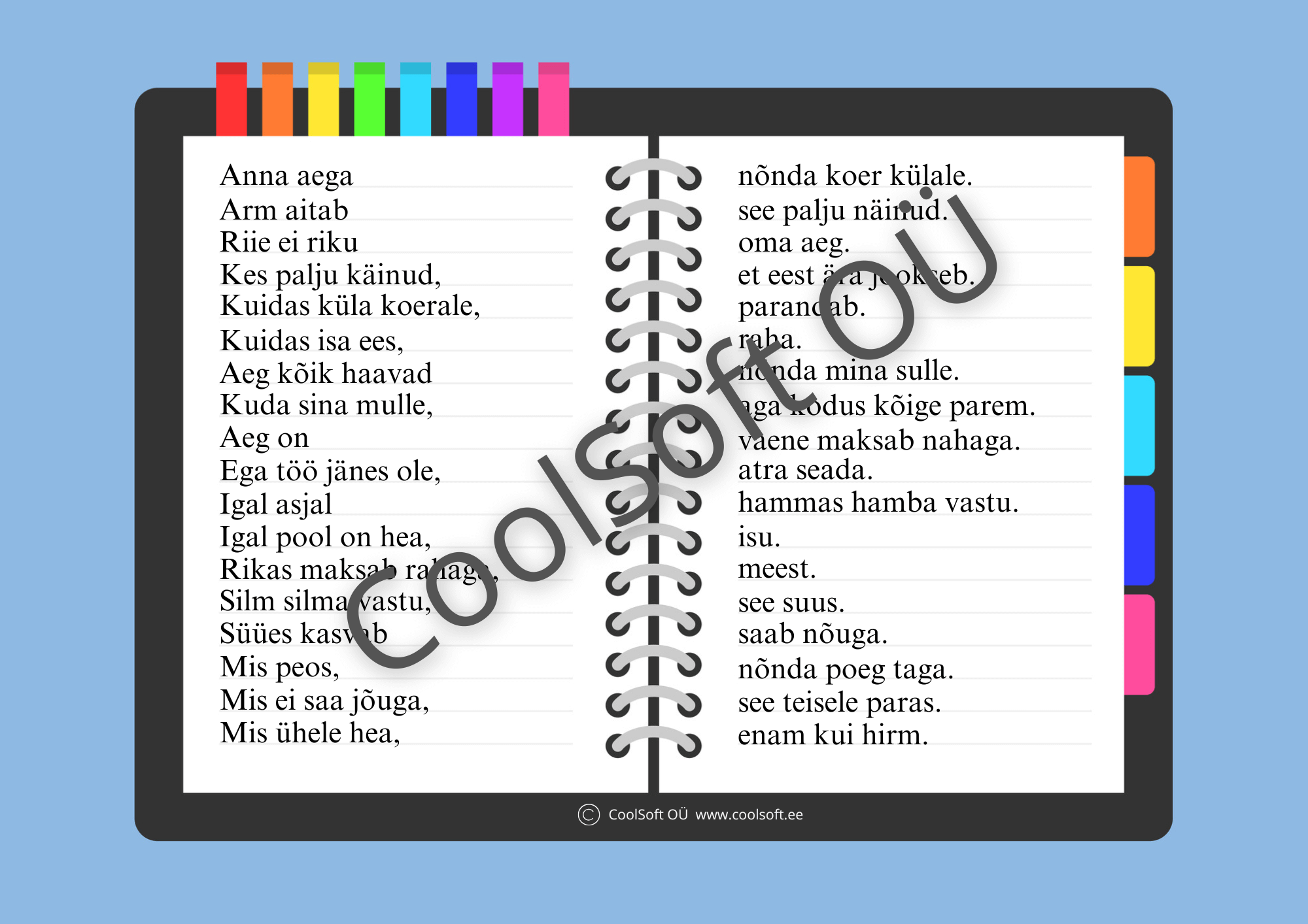 Igal leheküljel on erinevad vanasõnad, mis aitavad lapsel mõista keele kujundlikkust, tähendusi ja elutarkusi.