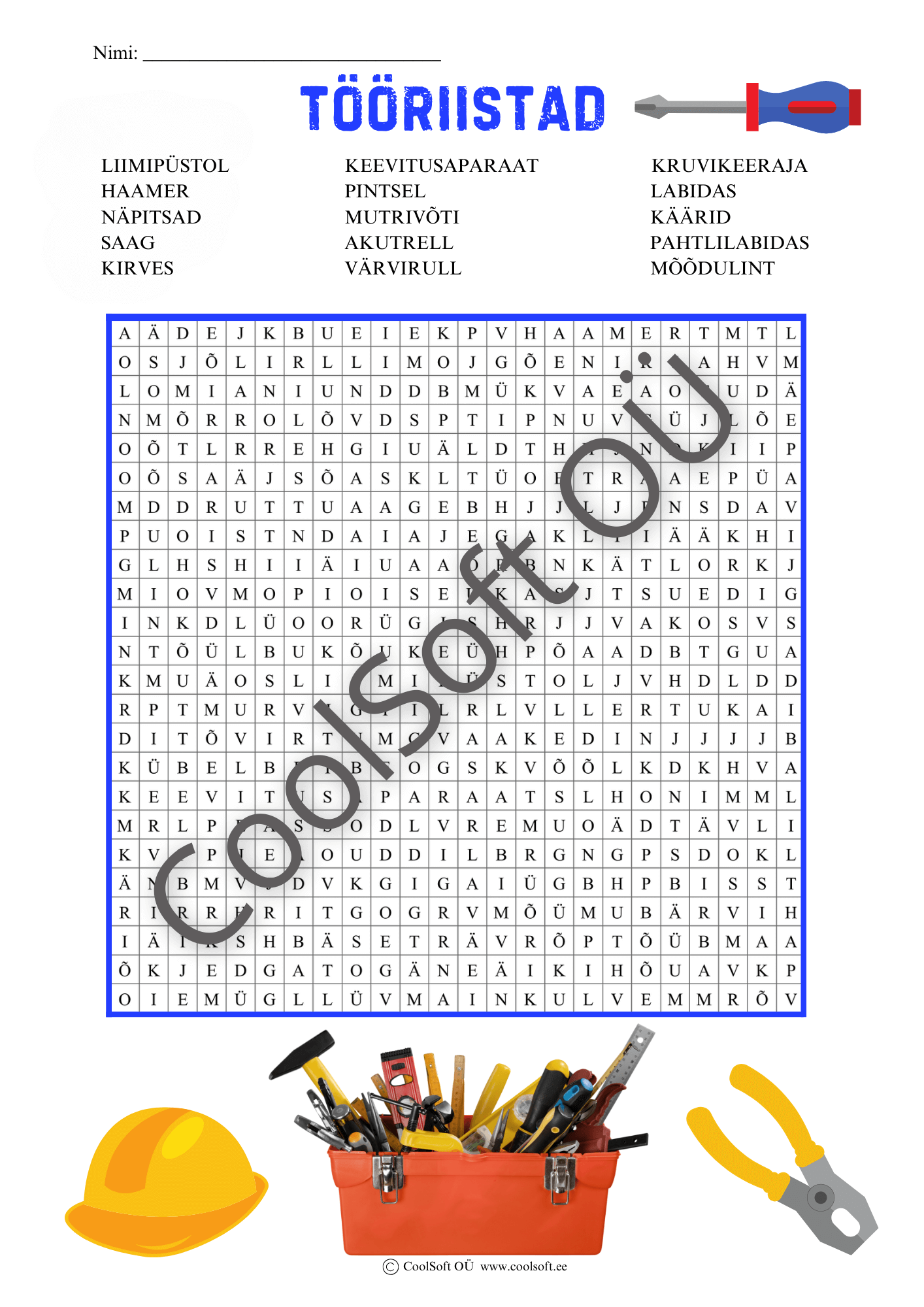 Tööriistad on arendav sõnaotsingu tööleht, kus laps otsib tähtede rägastikust erinevaid tööriistade nimetusi. 🔎🔧