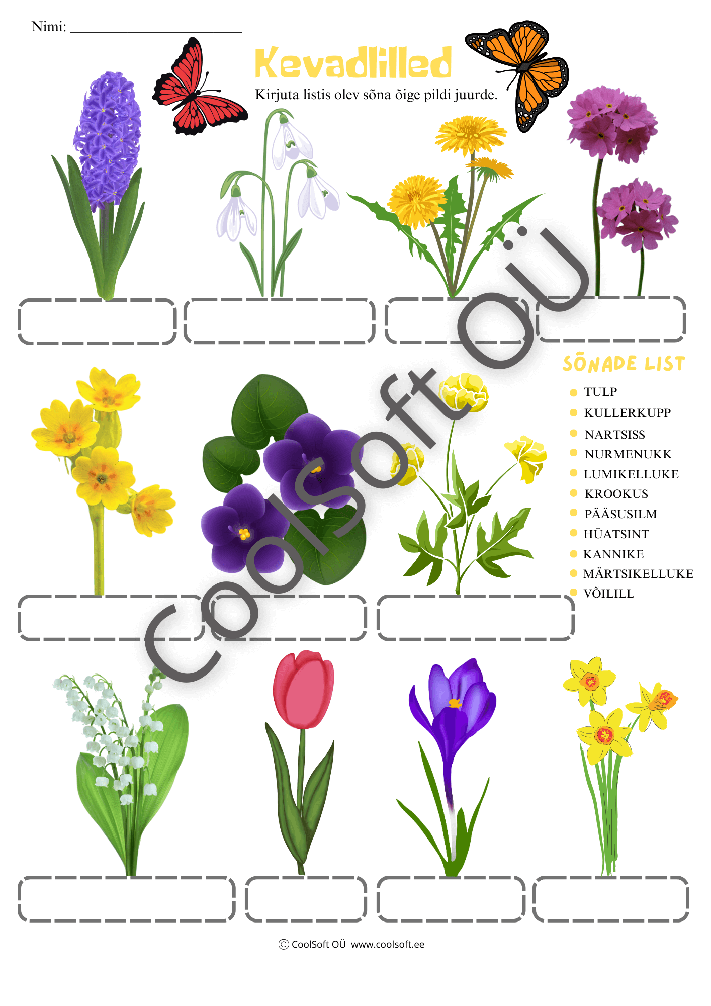 Õpi tundma erinevaid kevadlilli. Kirjuta iga pildi juurde kevadlille nimetus.