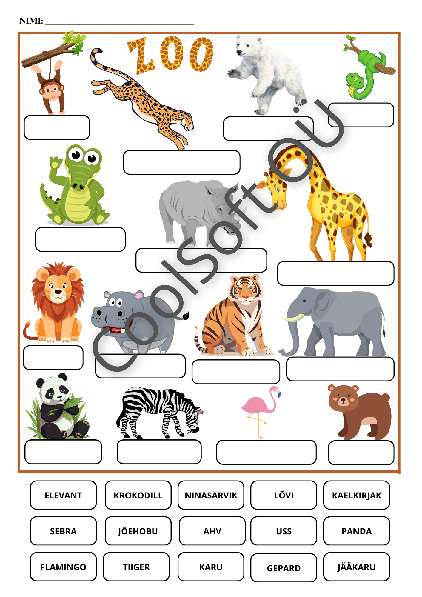 Zoo on värvikas ja kaasahaarav tööleht, kus laps õpib tundma loomade nimetusi eesti keeles. 🐼🦒