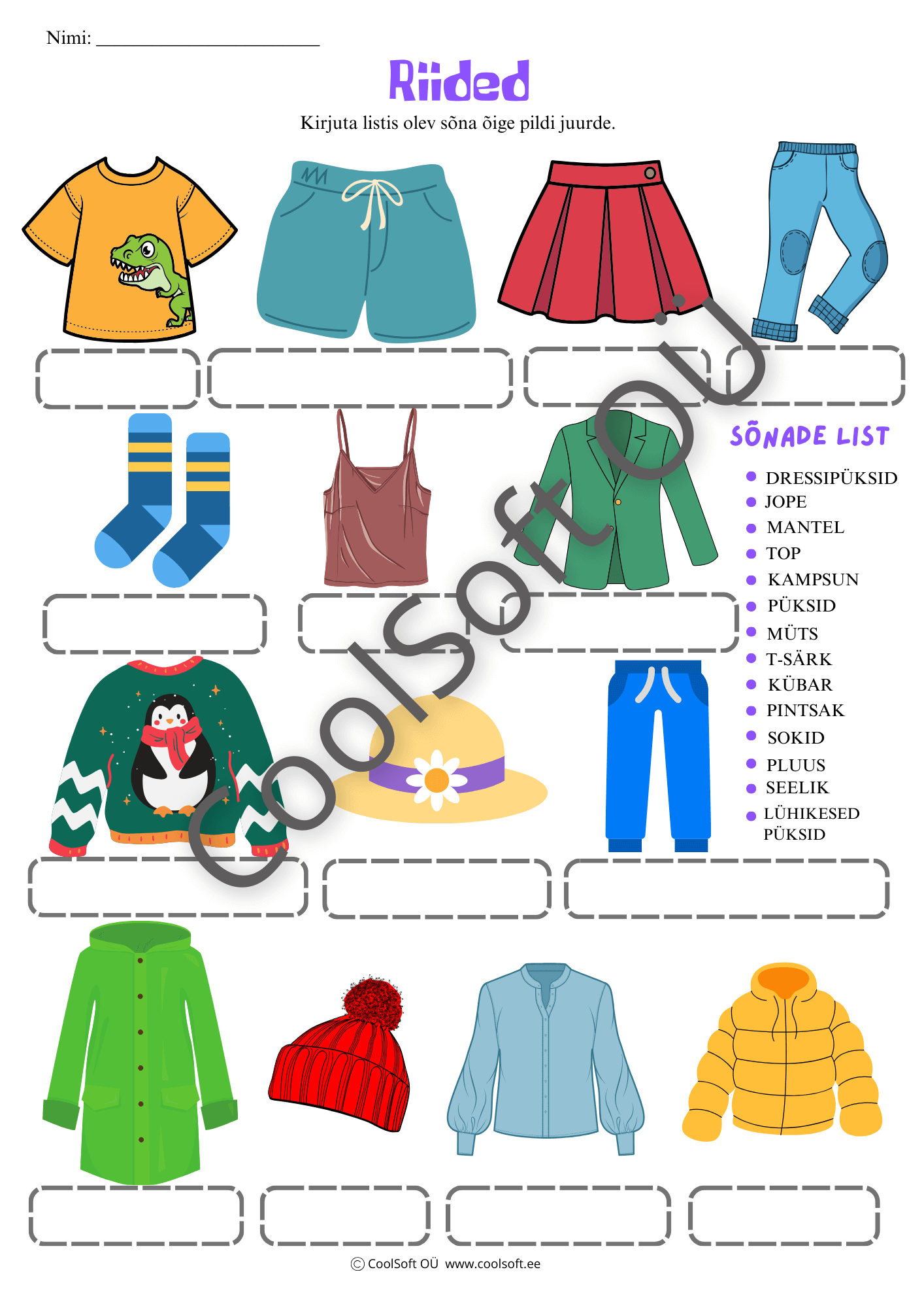 Õpi tundma erinevaid riideesemeid. Kirjuta iga pildi juurde riideeseme nimetus.