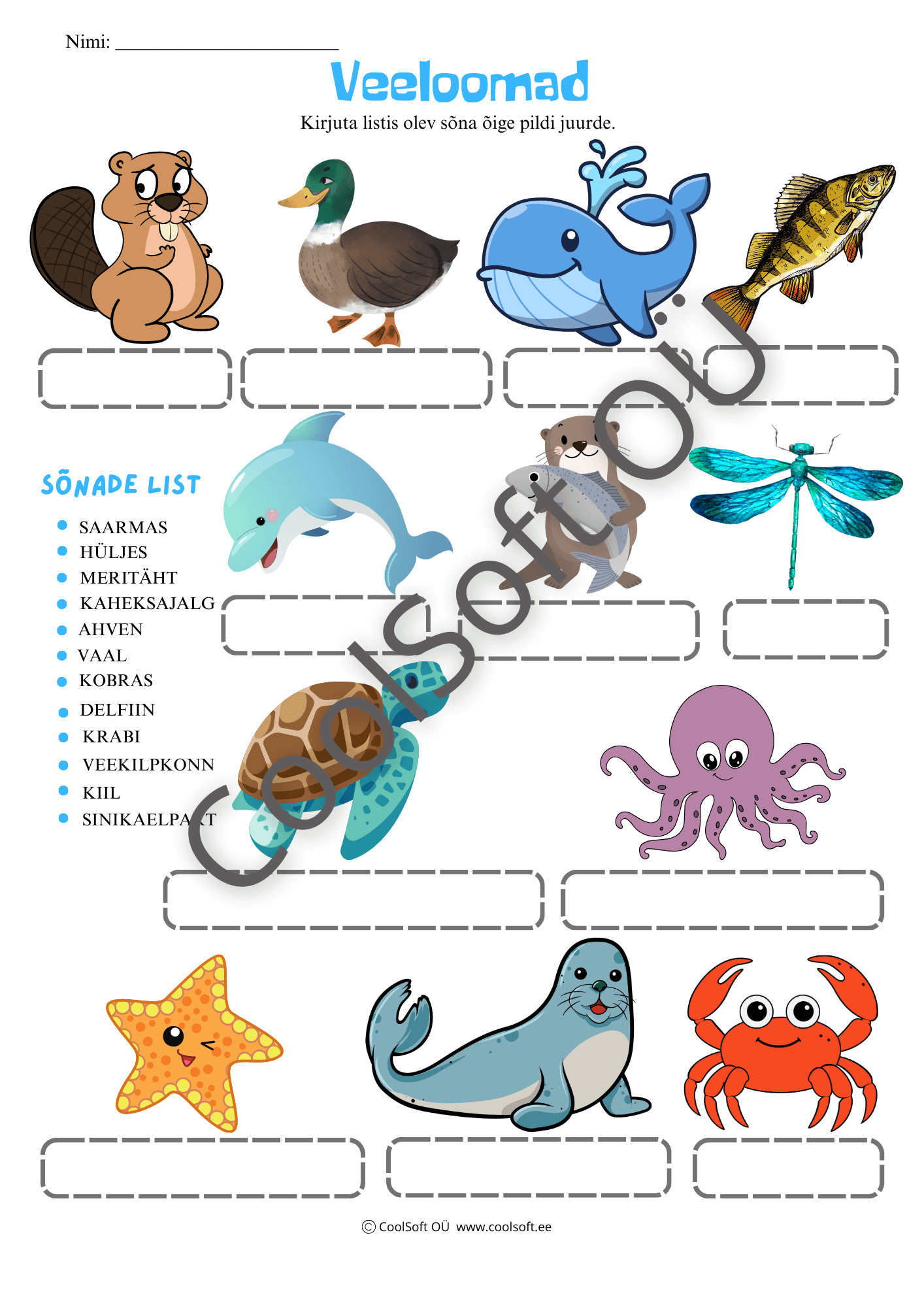 Veeloomad on mänguline ja visuaalselt selge tööleht, kus laps kirjutab loendis olevad veeloomade nimetused õigete piltide juurde. 🌊🐟
