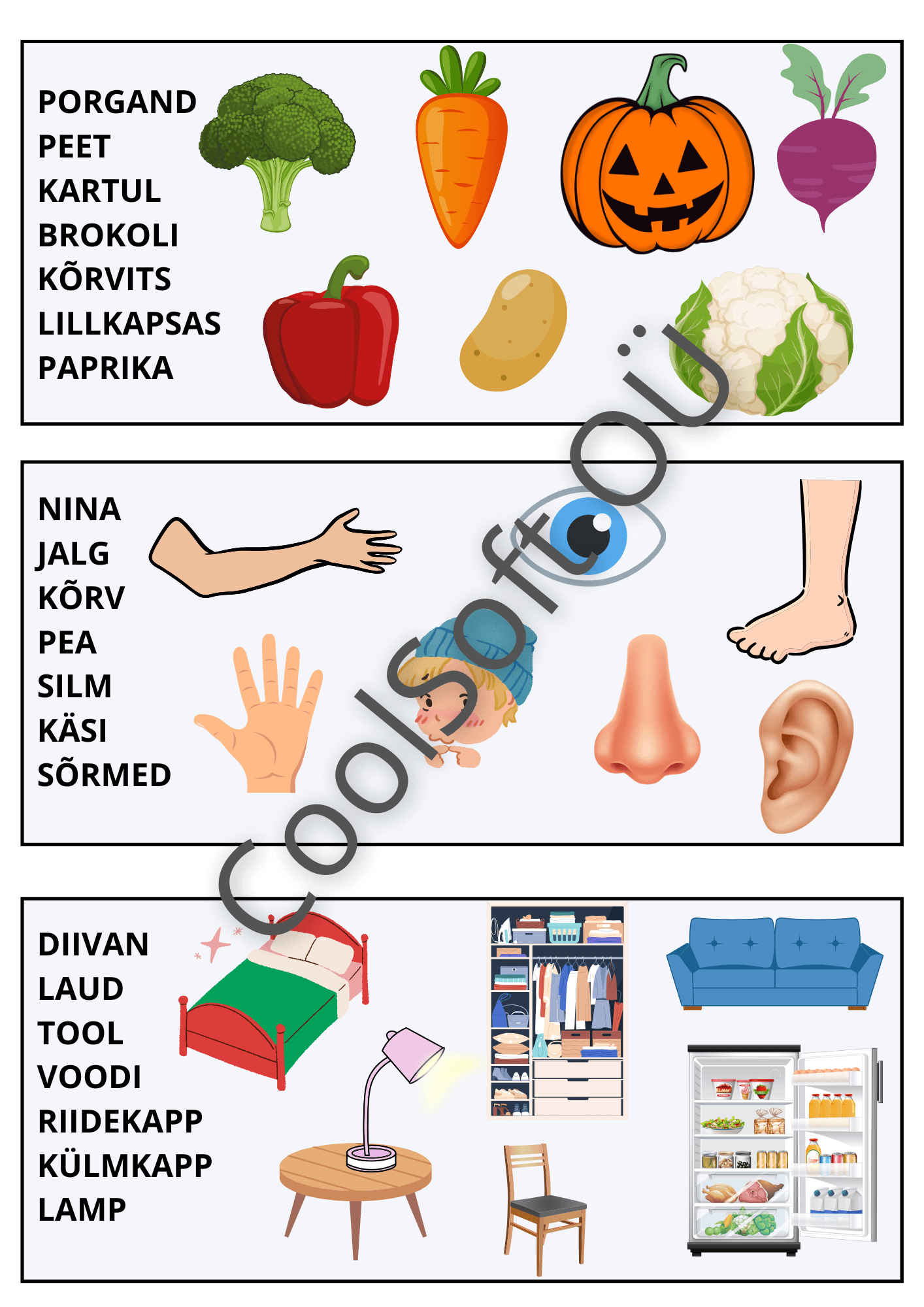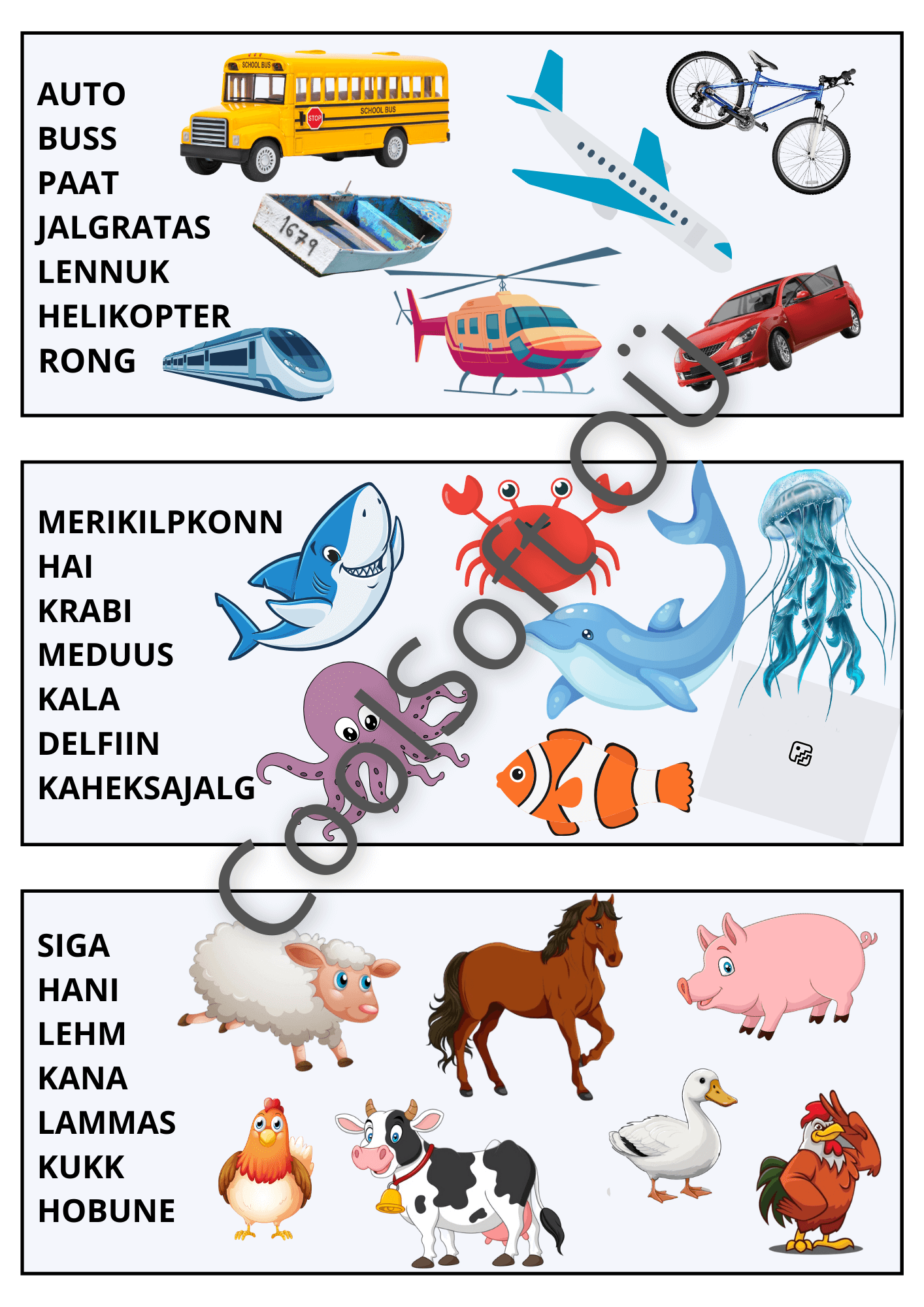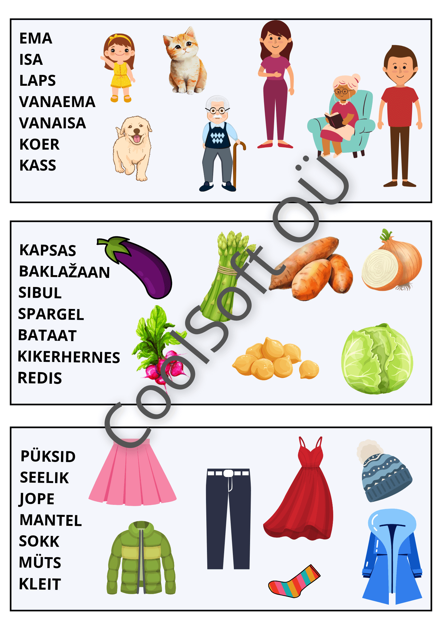 Igal lehel on eraldi teema(d) (nt sport, loomad, ilm, kodu, riigid, ametid, puuviljad, köögiviljad jm), kus laps seob sõna vastava pildiga, arendab sõnavara, tähelepanu ja keelelist mõtlemist.