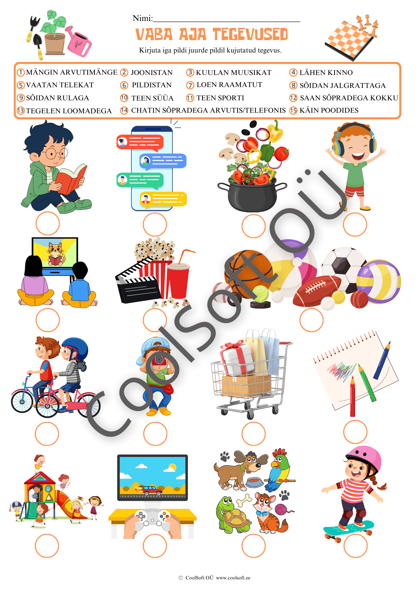See tööleht aitab lastel ära tunda ja nimetada erinevaid vaba aja tegevusi, seostades pilte vastavate tegevusnimetustega.