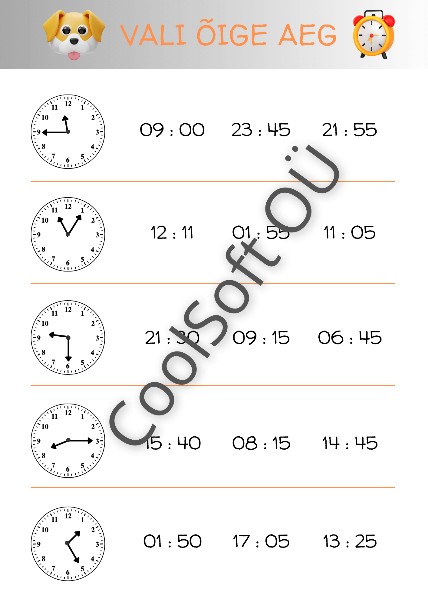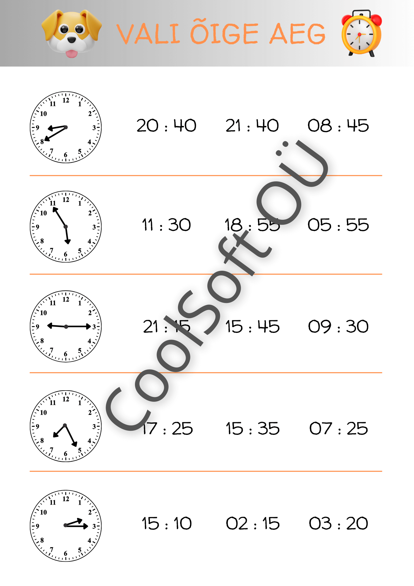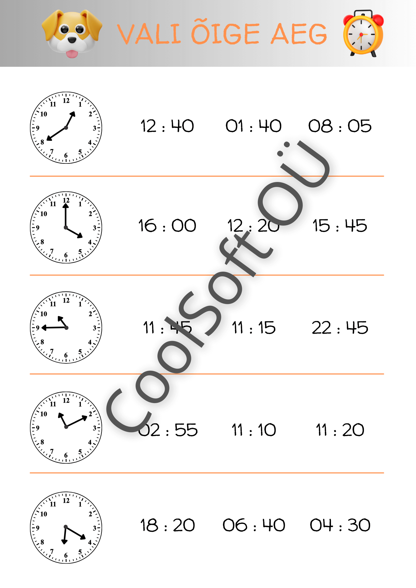 Vali õige aeg on põhjalik ja visuaalne töölehtede komplekt, mis aitab lapsel õppida kella lugemist ning analoogkella ja digitaalse kellaaja seostamist. Igal ülesandel on kellapilt ning mitu võimalikku kellaaega, millest laps peab valima õige.
