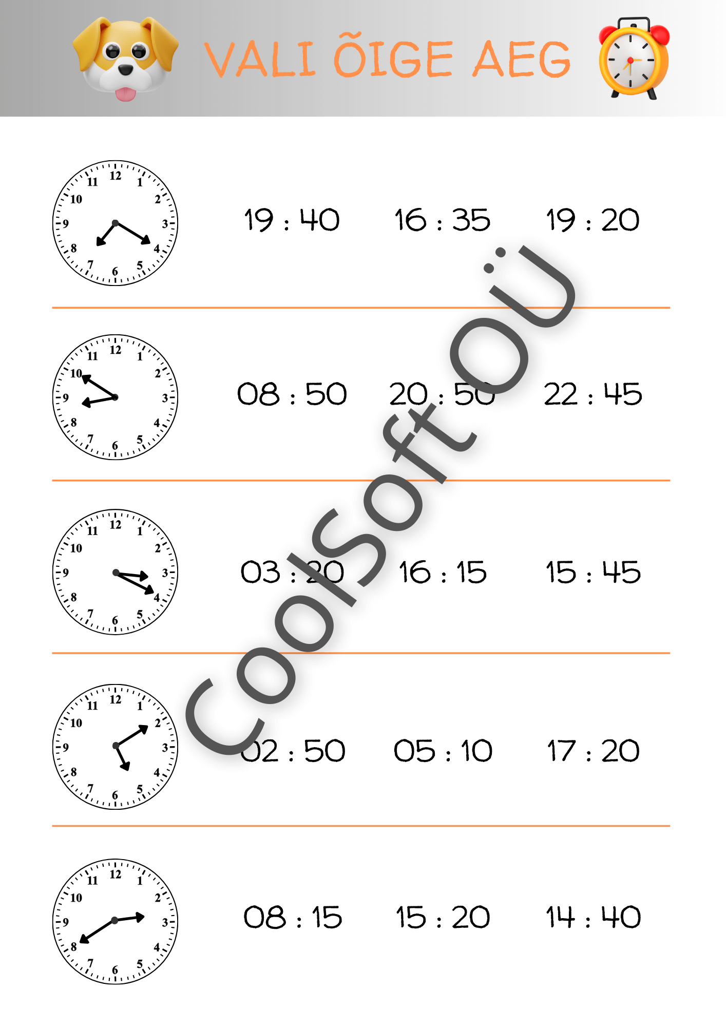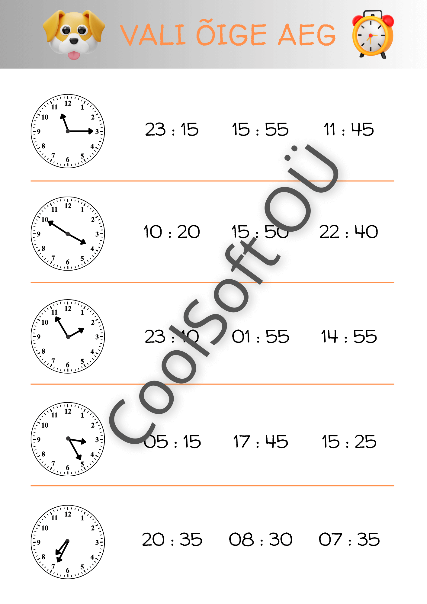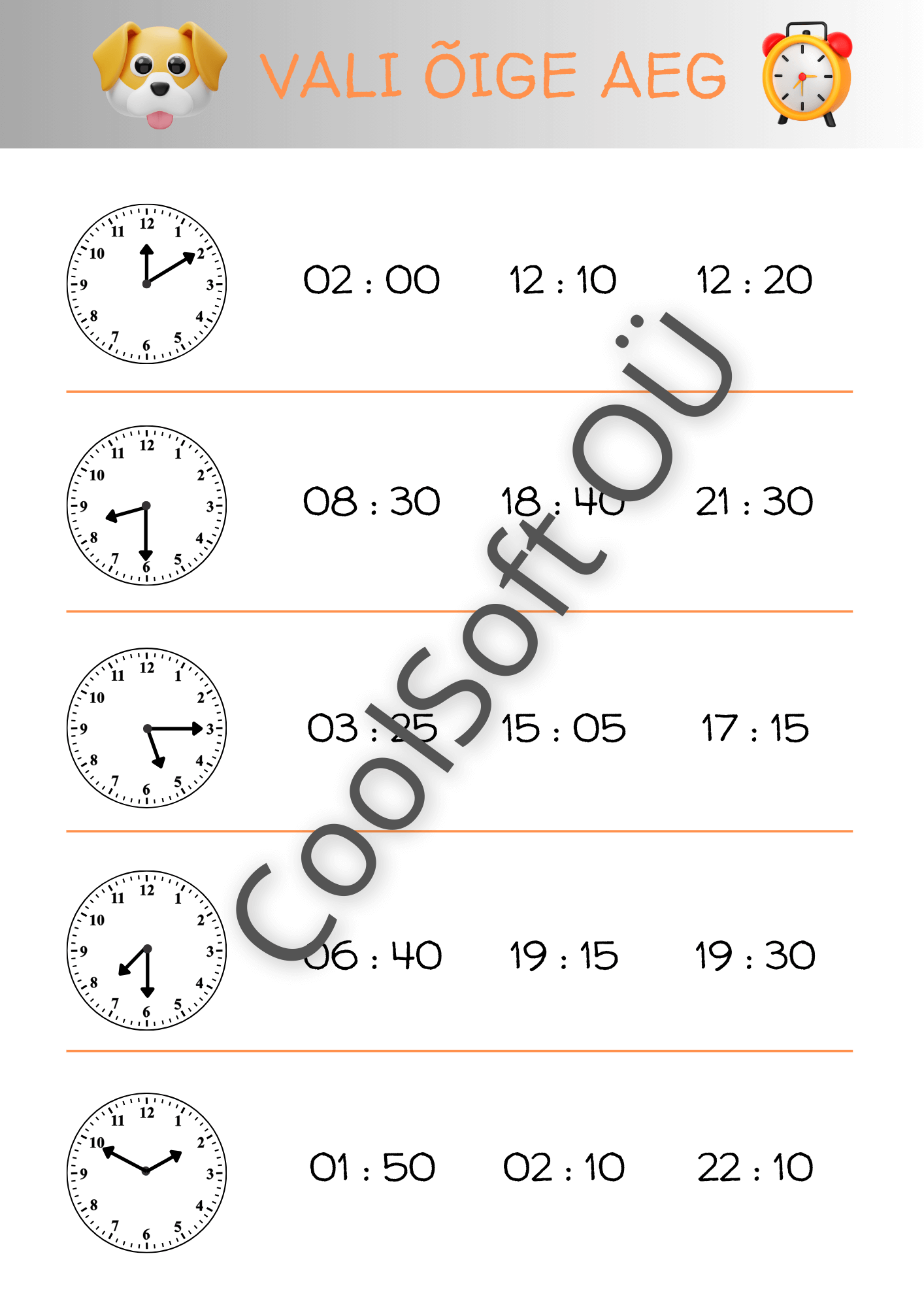 Vali õige aeg on põhjalik ja visuaalne töölehtede komplekt, mis aitab lapsel õppida kella lugemist ning analoogkella ja digitaalse kellaaja seostamist. Igal ülesandel on kellapilt ning mitu võimalikku kellaaega, millest laps peab valima õige.