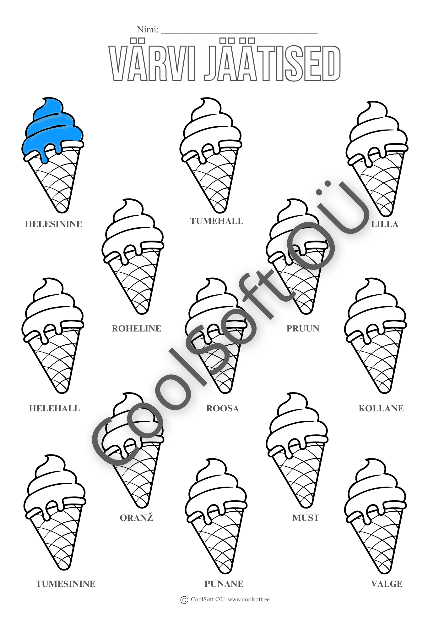 Värvi jäätised on lõbus ja arendav värvimistööleht, kus laps värvib jäätiseid vastavalt etteantud värvinimetustele.🍦🎨🌈