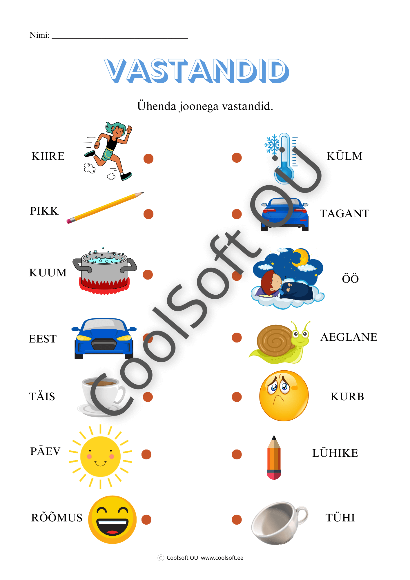 Vastandid on mänguline ja arendav tööleht (kokku 2 lk), kus laps ühendab joonega vastandlike tähendustega sõnad ja pildid. ✏️🔗