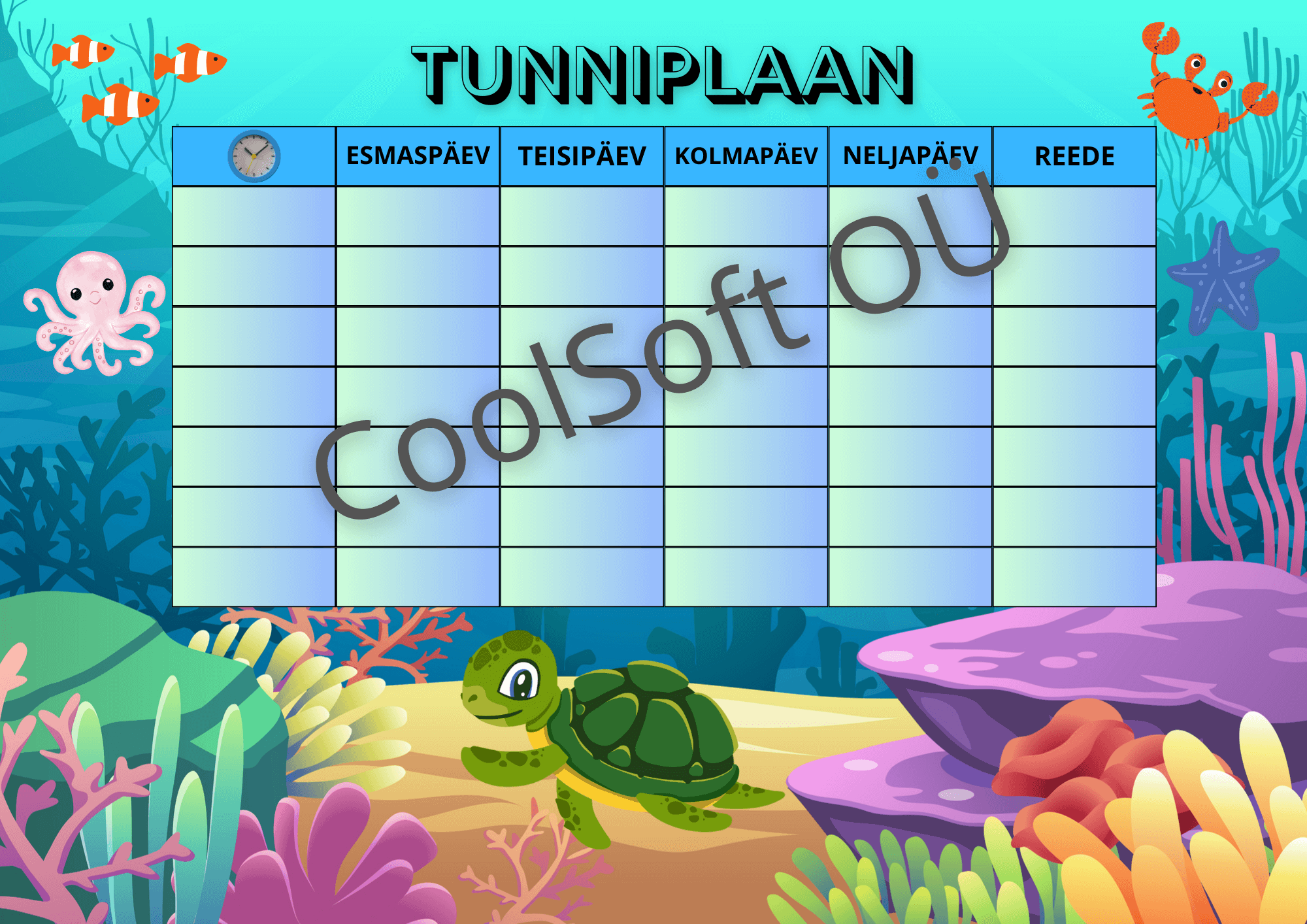 Veealune tunniplaan on selge ja värvikas tööleht, mis aitab lapsel oma koolinädalat struktureerida ja paremini planeerida. ⏰📚