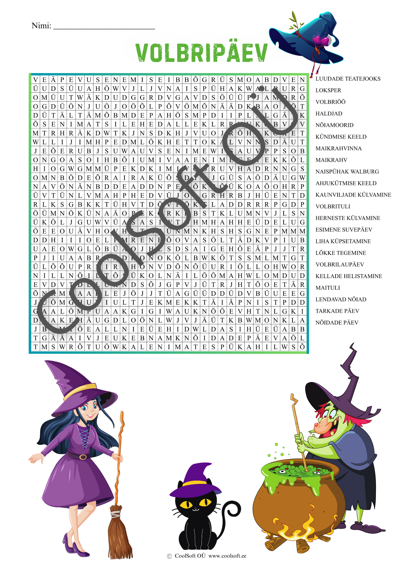 Volbripäev on temaatiline sõnaotsingu tööleht, mis aitab lapsel tutvuda volbripäeva ja kevadiste rahvakommete sõnavaraga. Ülesandeks on leida täherägastikust volbripäevaga seotud sõnad, kasutades kõrval olevat sõnaloendit. 🔍🌿